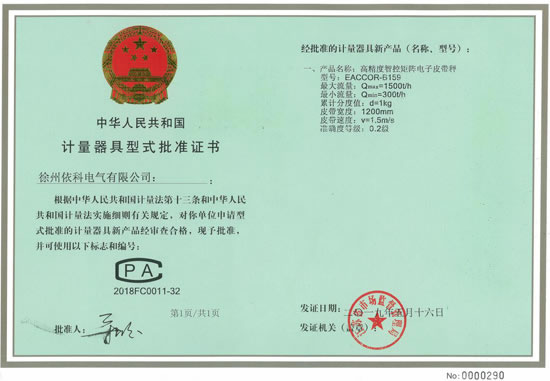 热烈祝贺徐州依科电气有限公司专利技术高精度智控矩阵电子皮带秤EACCOR-B159获得0国家0.2级计量证书CPA2018FC0011-32批准证书,配套高精度矩阵传感器及矩阵智能称重控制器(采用SEQ-AI智能算法,矩阵控制跟踪复核技术,...